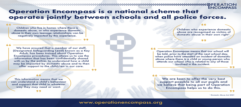 Through Operation Encompass the police will share information with The Link Academy about ALL police attended domestic abuse incidents which involve any of our children who are related to either of the adults involved in the incident. This sharing of information will occur PRIOR to the start of the next school day. The notification will inform us about the context of the incident and will include the Voice of the Child.